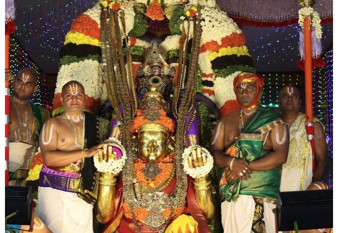 The Garuda Seva procession was off to a colorful start at 6.30 p.m. amid sonorous chanting of Govinda Govinda by devotees. The ecstasy reached a feverish peak as the procession of Lord Malayappa Swamy seated atop the bespangled vehicle was brought out of the Vahan Mandapam. Adding grandeur to the festival, the Deity was adorned with rare, precious and antique jewelry such as Makarakanti, multi-layered golden Sahasranamavali Haram, Lakshmi Kasula Haram, diamond-studded golden crown among others. With all the roads leading into the temple town remaining chock-a-block, pilgrims wishing to have the darshan of the presiding Deity inside the temple were instructed to join the queue lines from the Silathoranam point.