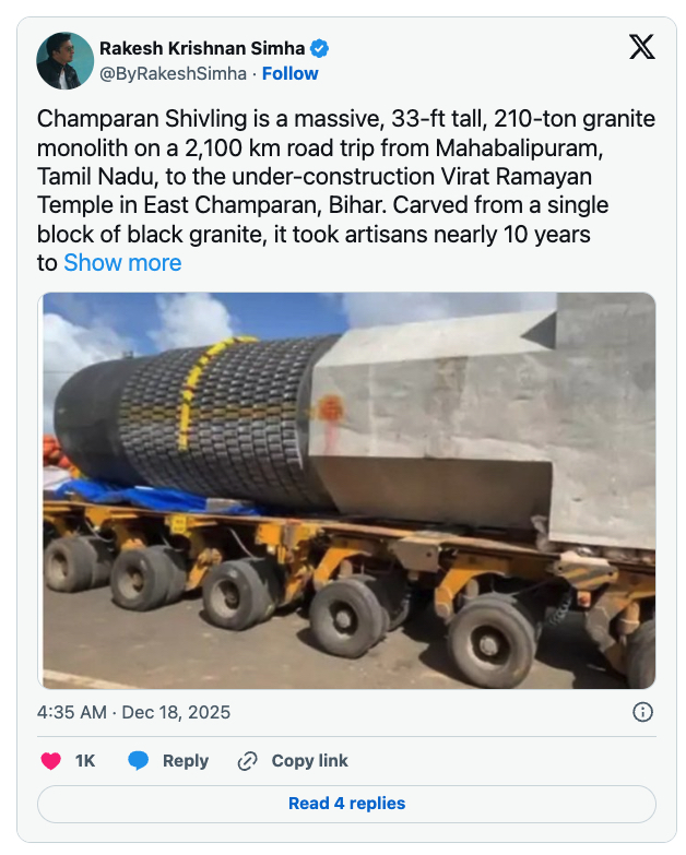 https://organiser.org/2025/12/19/331023/bharat/worlds-tallest-monolithic-33-foot-shivling-begins-2100-km-journey-from-tamil-nadu-to-virat-ramayan-mandir-in-bihar/