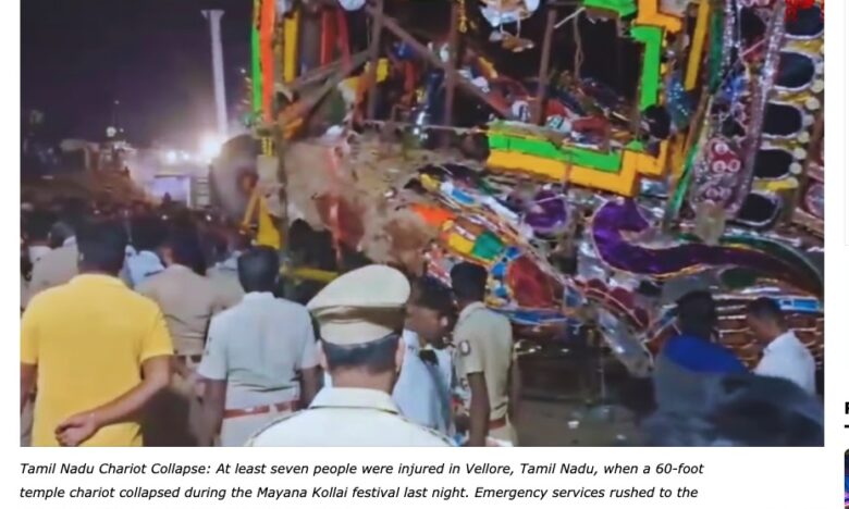 TAMIL NADU, February 17, 2026 (Times Now News): At least seven people were injured in Vellore, Tamil Nadu, when a 60-foot temple chariot collapsed during the Mayana Kollai festival last night (February 16). Thousands of devotees had gathered to enjoy the festivities, but celebrations turned chaotic after the collapse. Police, rescue teams and locals rushed to assist those caught in the accident. The situation is now under control. The collapse may have been caused by the sheer weight of the decorated wood and metal, which can cause the central axle to snap or the wheels to buckle, especially if the chariot has not been maintained during the off-season. Due to rising competition, the chariots often reach heights of 60 to over 100 feet. These structures are often narrow at the base but heavily decorated at the top, making them inherently unstable.