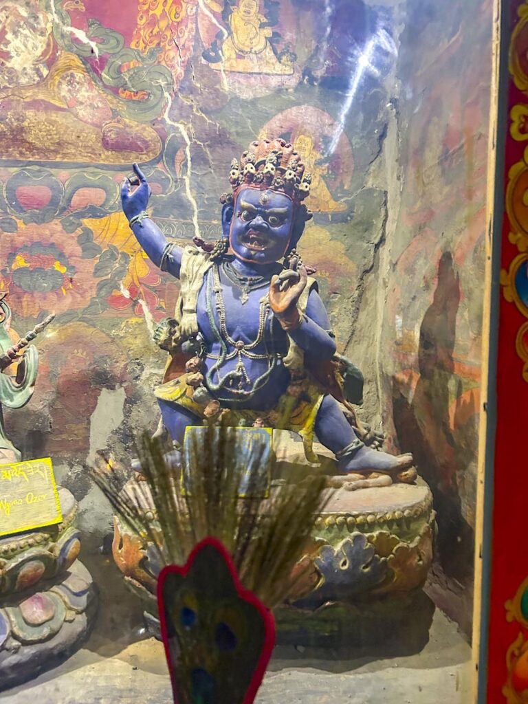 Mahakala is central here, especially in the Sakya tradition followed by many of the monasteries in Mustang. This Deity is primarily revered as a guardian of the monastic community and the spiritual path. Its iconography depicts a dark-skinned figure, crowned with skulls and wearing a garland of bones. In fact, Mahakala and Bhairava are arguably the same protector Deity in both religious traditions, and both are widely worshiped in Nepal. They represent a fierce energy directed toward the welfare of the devotee or the community.