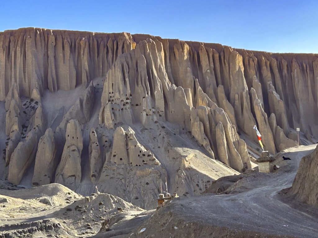 That evening, we camped near Chhusang village (#5), the cliffs glowing like gold as the sun set. Early the next morning, we crossed another pass and descended into a secluded valley where a Buddhist cave monastery is located. It is said to have been a meditation retreat of Padmasambhava (Guru Rinpoche), the tantric master who introduced Vajrayana Buddhism to Tibet in the 8th century.