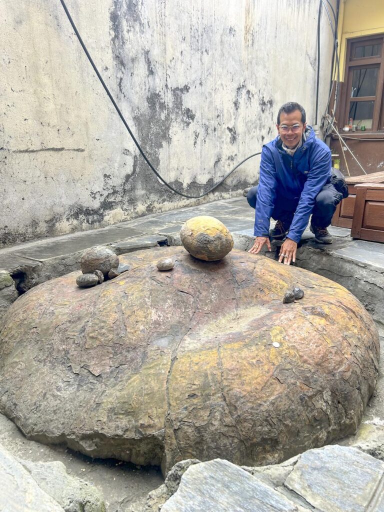 In the afternoon, I spoke with the sadhus who dwell around the temple. Some had walked for months from Tamil Nadu and Andhra Pradesh, drawn by the same quiet pull of devotion. One of them, Kumar Baba from Tirunelveli, led us downstream to search for Shalagramas. By then, my own bags were already heavy with stones gathered along the way, and I was beginning to tire of them. Yet, upon returning to town, I stumbled upon what must be one of the largest Shalagramas in existence—surely a contender for a Guinness World Record: a colossal Kurmavatara Shalagrama embedded in the floor of my hotel, likely unearthed during its construction. It was more than five times the size of the one I had seen earlier in Yara. The sight made it clear that this land had once been abundant with Shalagramas, with the temple of Muktinath standing at its sacred heart.