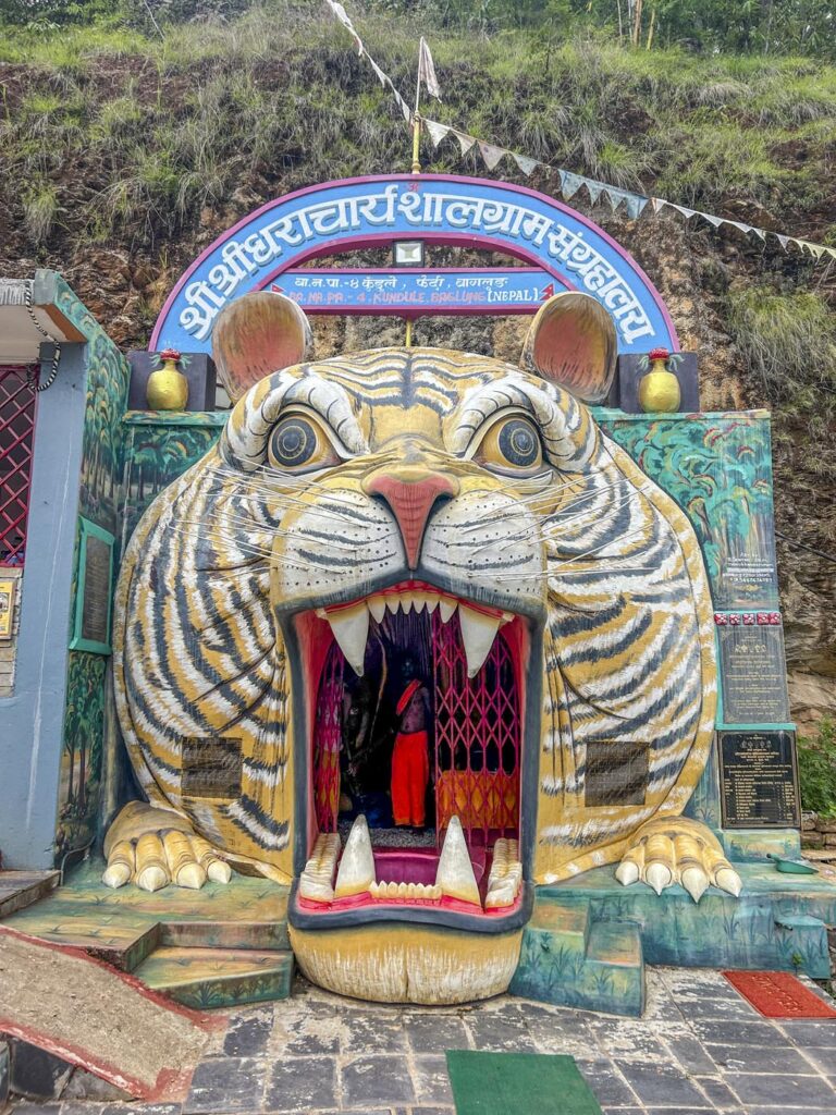 The next day, we began our return to Pokhara, stopping at the Shalagrama Museum run by a local Vaishnava pathasala. As we arrived, a few students were struggling to roll a huge Shalagrama into the museum’s display—it had just been donated by a villager who found it while digging in his field. The museum, located in the vicinity of a Vishnu temple built in a distinctive South Indian style complete with a dvajastambha (flagpole) and vimana (sanctum crown), has a fantastical, theme-park-like entrance shaped like a tiger’s mouth, through which visitors walk into a cave. Inside, there must be over 100,000 Shalagramas of different shapes and forms. They are at least 65 million years old.